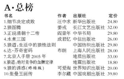 看看本周的榜單,帶給讀者的再次是了無新意的失望。我們惟一可以安慰的,是兩本同時(shí)上榜的《狼道》,既不是來自以《狼圖騰》占領(lǐng)傳統(tǒng)市場的長江文藝出版社,也不是以《狼的誘惑》吸引年輕讀者的世界知識出版社。對2004年來說,“狼”或許真的已經(jīng)成了圖騰,但是負(fù)責(zé)任的出版人不會永遠(yuǎn)跟著圖騰走?梢钥隙ǖ氖牵瑘D騰不可能永遠(yuǎn)有效。