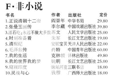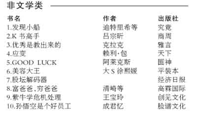 隨著12月的到來,對于出版界來說,2004年實(shí)際上已經(jīng)結(jié)束了。在2004年的最后一個(gè)月里,不大可能出現(xiàn)多少有分量的圖書了,大家都在為新的一年積蓄力量。于是在我們的榜單上,依然是那些夏季以來一直暢銷著的圖書成為主角。