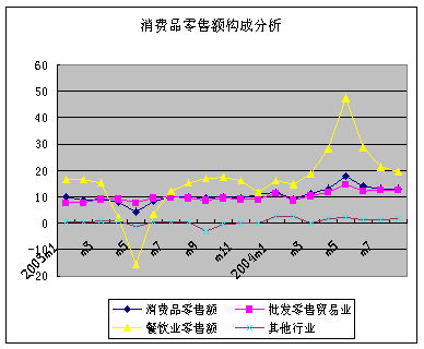 今年我國(guó)消費(fèi)品市場(chǎng)的增長(zhǎng)分為兩個(gè)階段。上半年為第一階段——平緩增長(zhǎng)階段,3季度以后為第二階段——加速增長(zhǎng)階段。今年上半年消費(fèi)品零售額同比增長(zhǎng)12.8%,名義增長(zhǎng)較高,但是由于上半年消費(fèi)增速大幅提高受到物價(jià)因素和2003年非典因素的影響,扣除物價(jià)和去年基數(shù)影響,今年上半年消費(fèi)品零售額的真實(shí)增長(zhǎng)速度約為8.9%,這個(gè)增速比非典發(fā)生之前消費(fèi)的實(shí)際增速低0.5個(gè)百分點(diǎn)。因此,今年上半年消費(fèi)增長(zhǎng)并不快,相比于投資28.6%的較快增長(zhǎng),消費(fèi)顯得有些偏冷。