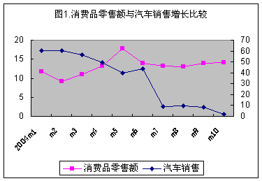 汽車消費(fèi)是新一輪居民消費(fèi)結(jié)構(gòu)升級(jí)中的標(biāo)志性產(chǎn)品,但是,今年以來汽車銷售增速不斷降低。一季度限額以上汽車銷售額增長(zhǎng)56.5%,上半年增長(zhǎng)43.7%,7、8月降為9%和9.8%,10月進(jìn)一步下降為2.1%。增幅不僅比去年同期和前幾個(gè)月增速低幾十個(gè)百分點(diǎn),而且低于消費(fèi)品零售總額的平均增長(zhǎng),汽車銷售下降與消費(fèi)品零售總額增長(zhǎng)上升呈反向變化(見圖1)。汽車銷售下滑直接影響到產(chǎn)量。據(jù)最新統(tǒng)計(jì),10月份全國(guó)共生產(chǎn)轎車14.35萬輛,比上年同月下降14.2%,當(dāng)月產(chǎn)量比9月份下降19.1%,僅及3月份最高時(shí)的58.5%。今年最后兩個(gè)月轎車生產(chǎn)同比繼續(xù)下降的可能性極大,全年轎車產(chǎn)量即使按下調(diào)后的239萬輛的預(yù)測(cè)目標(biāo)也難以實(shí)現(xiàn)。今后兩個(gè)月轎車產(chǎn)銷下降基本已成定局,汽車工業(yè)已提前進(jìn)入嚴(yán)冬期。
