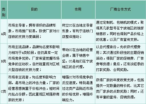 在與廠家合作中,CC看人下菜,區(qū)別對(duì)待。通過(guò)對(duì)合作品牌的定位分析,分別給予不同供應(yīng)商以相應(yīng)的銷(xiāo)售支持,從而獲得他們?cè)谡摺r(jià)格、產(chǎn)品等方面的支持回報(bào)。特別是在各種渠道政策方面,除了固定的年返外,還得到階段性的打款獎(jiǎng)勵(lì)、現(xiàn)金提貨獎(jiǎng)勵(lì)、廣告費(fèi)支持等綜合支持。