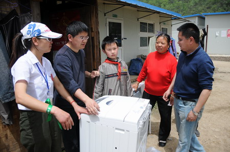 孩子楊進(jìn)寶的母親在地震中遇難,他希望的是一臺(tái)洗衣機(jī),以幫助爸爸洗衣服。望著洗衣機(jī)的包裝盒,他的眼眶紅了。他說(shuō),這下可以給爸爸減輕一點(diǎn)負(fù)擔(dān)了。