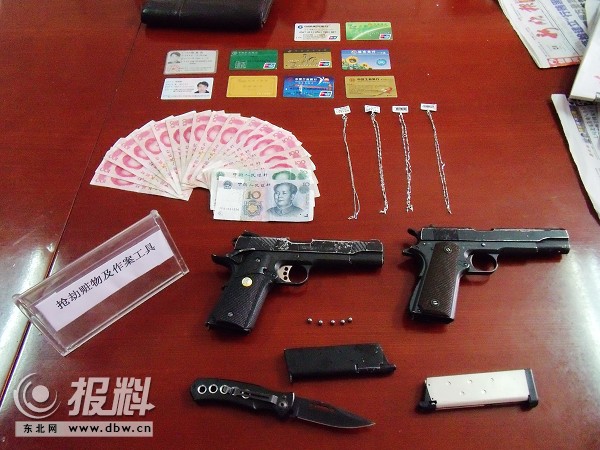 5月21日9時10分,備受關(guān)注的哈爾濱好又多超市金店特大持槍搶劫案2名主要嫌犯被抓獲,繳獲作案用仿真鋼珠手槍2支、匕首1把,繳回9條被搶白金項鏈。