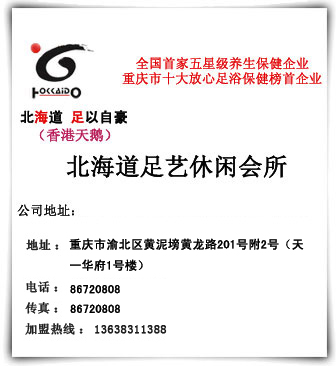 重慶北海道健身休閑會(huì)所有限公司成立于2001年12月6日,系天鵝(香港)酒店管理集團(tuán)為滿足重慶地區(qū)高層次人士足浴保健的需要,按高星級(jí)酒店標(biāo)準(zhǔn)投資打造和管理的新型休閑保健服務(wù)機(jī)構(gòu)。