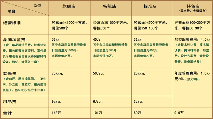 1 、品牌加盟費 45 萬(含三年品牌使用費,技術(shù)培訓(xùn)費,相關(guān)配套方案資料,宣傳品及專用設(shè)備包含金漢森自釀鮮啤設(shè)備(日出酒量為 800 升 ,市場價值 28 萬)、烤爐、烤箱各一套)
