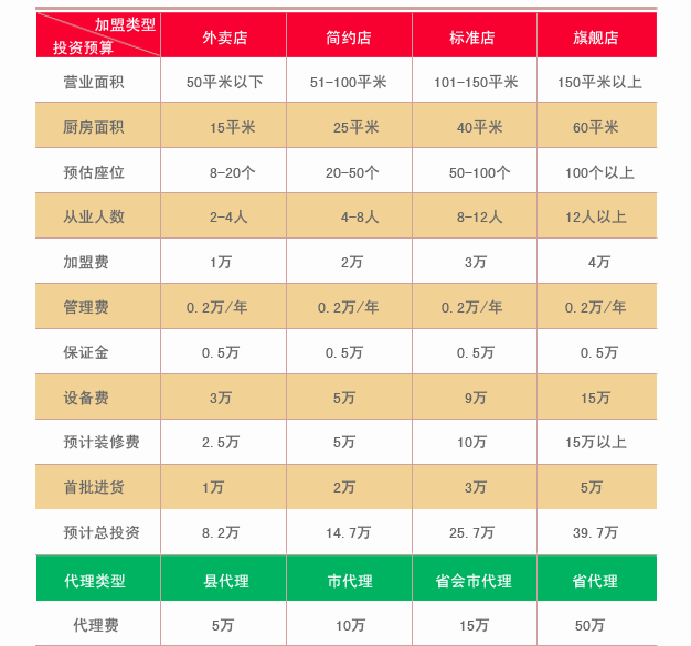 說(shuō)明:以上投資預(yù)算僅供參考,且不包括店面租金和求租店面所產(chǎn)生的轉(zhuǎn)讓費(fèi)用,所標(biāo)注的預(yù)