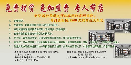 6、 建立統(tǒng)一的品牌形象,公司免費提供店面設計裝修圖,店鋪宣傳物料,確保“伊麗莎白”品牌的統(tǒng)一形象;