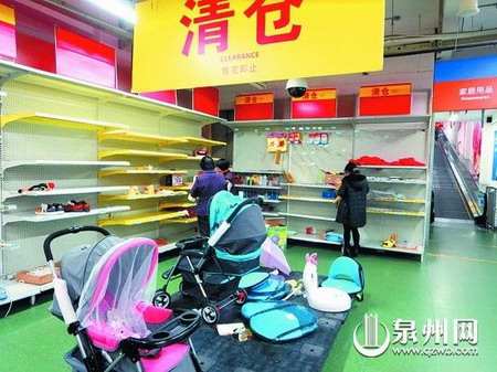 昨日上午10點多,記者來到中心市區(qū)沃爾瑪刺桐分店,一樓商家已全部撤出,整層樓空蕩蕩的。乘坐電梯進入超市,超市二樓至四樓的大半貨架都已清空,處處可見清倉的標語。偌大的超市內(nèi)見不到幾個導購人員,只有一些市民在挑選清倉商品。四樓也只有兩個收銀臺開放。“30日就要停業(yè)了。”一名超市員工告訴記者,停業(yè)后,一些員工選擇離職,一些人選擇到沃爾瑪江濱北路分店工作。
