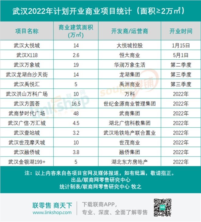 2022年,武漢還將有一批備受關(guān)注的知名商業(yè)體亮相。據(jù)聯(lián)商網(wǎng)零售研究中心統(tǒng)計(jì),2022年,武漢將有13座購物中心入市。其中,武漢萬象城、武漢大悅城、武漢龍湖白沙天街、武商夢(mèng)時(shí)代廣場(chǎng)、武漢方圓薈、武漢禹悅匯等重量級(jí)購物中心的面世,將加速推動(dòng)武漢多個(gè)核心商圈的迭代升級(jí),也將改變武漢商業(yè)的傳統(tǒng)格局。