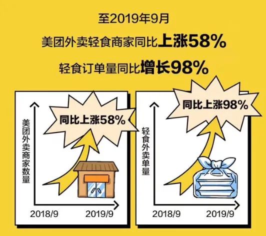 與開(kāi)在都市商圈的輕食餐飲店不同,輕食外賣省去了大部分的店租成本,據(jù)媒體報(bào)道,8-10萬(wàn)元即可開(kāi)一家外賣加盟店,而且比起其他餐飲行業(yè)來(lái)說(shuō),輕食的制作門(mén)檻也相對(duì)更低。根據(jù)美團(tuán)外賣發(fā)布的《中國(guó)輕食外賣消費(fèi)報(bào)告》顯示,截至2019年9月,美團(tuán)外賣輕食訂單量同比增長(zhǎng)98%,輕食商家數(shù)量同比增長(zhǎng)58%。