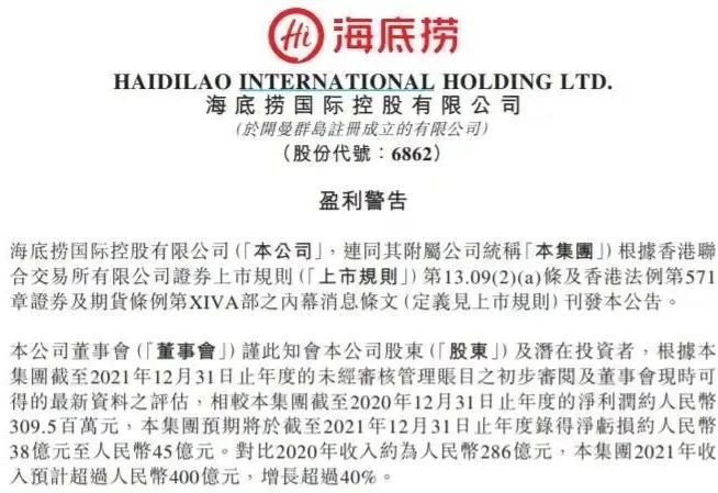 2月21日,海底撈發(fā)布了一份盈利警告——預(yù)期將于截至2021年12月31日止年度錄得凈虧損約人民幣38億元至人民幣45億元。對(duì)比2020年收入約為人民幣286億元,集團(tuán)2021年收入預(yù)計(jì)超過(guò)人民幣400億元,增長(zhǎng)超過(guò)40%。