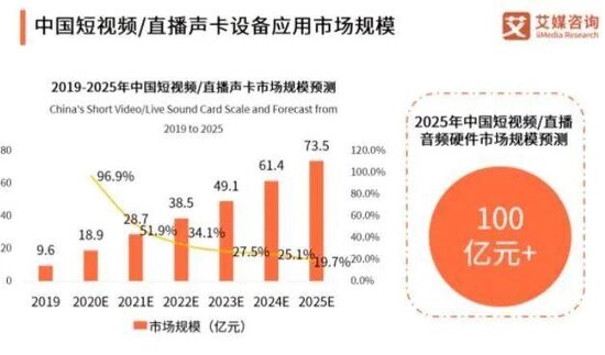 數(shù)據(jù)顯示,隨著短視頻直播設(shè)備滲透率的不斷提升,2020年直播硬件設(shè)備市場規(guī)模達到18.9億元,預(yù)計至2025年,其行業(yè)規(guī)模將超過100億元。