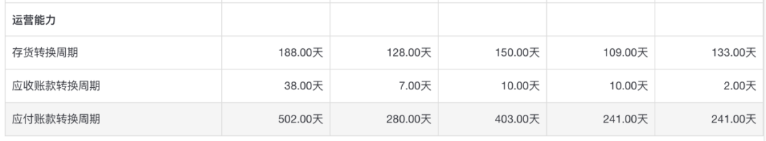 其中,報(bào)告期內(nèi),其存貨周轉(zhuǎn)周期升至188天,去年同期為128天;應(yīng)收賬款轉(zhuǎn)換周期為38天,去年同期為7天;應(yīng)付賬款轉(zhuǎn)換周期為502天,去年同期僅為280天。再往前看,以上三個(gè)數(shù)值均創(chuàng)下國(guó)美零售自2008年以來(lái)的最高值,運(yùn)營(yíng)效率下滑明顯。