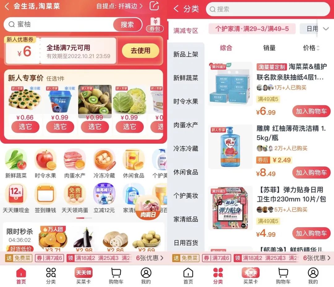 在APP端,淘菜菜入口位于淘寶APP和淘特APP首頁,且同樣越過了“團長”角色,用戶可直接下單,并在社區(qū)店進行提貨。在供給端,淘菜菜的業(yè)務重點是:利用并改造穩(wěn)定的社區(qū)小店,同時打通生鮮供應鏈。