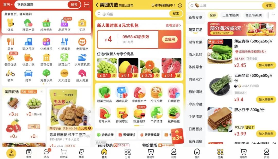 點進美團APP可以看到,“美團優(yōu)選”按鈕位于首頁,且信息流推薦的靠前位置也出現(xiàn)了“美團優(yōu)選”相關商品展示,與之相伴的是“更優(yōu)惠”、“明日達”等標簽,與“明日達超市”定位相符。