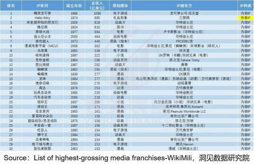 全球最有價值的IP top30榜單顯示,前30個IP中只有Hello Kitty為形象IP,其余皆為內(nèi)容IP。