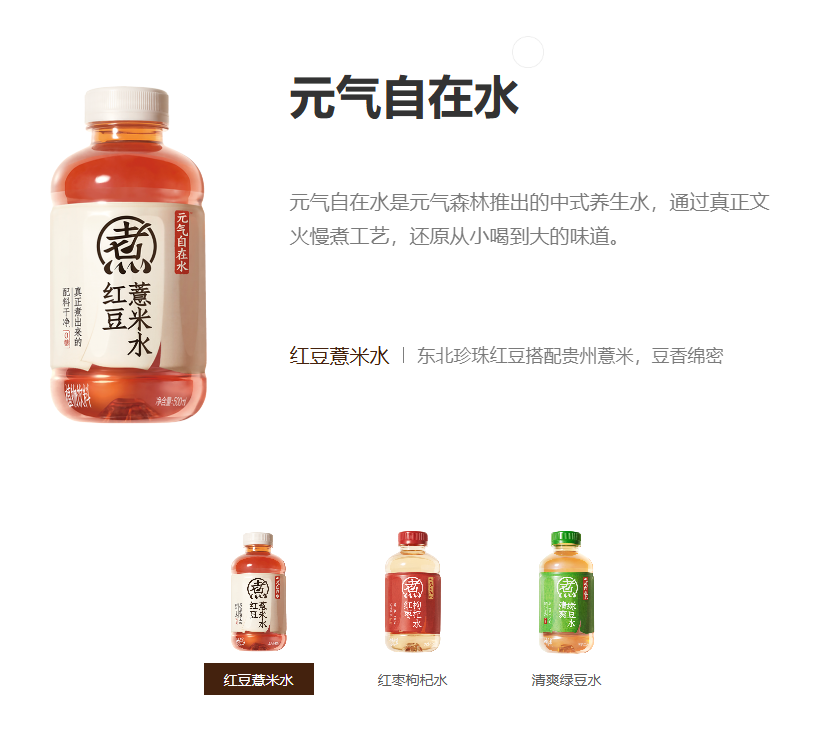 有需求就有供應。目前,已經(jīng)有多家企業(yè)盯上了中式養(yǎng)生水這個細分賽道,前面提到的元氣森林就是其中的佼佼者。“元氣自在水”是元氣森林推出的中式養(yǎng)生水品牌,目前有三種口味,紅豆薏米水、紅棗枸杞水、清爽綠豆水。天貓元氣森林旗艦店顯示,自在水嘗鮮裝,15瓶售價66元。雖然自在水產(chǎn)品不多,但銷量不錯。據(jù)悉自2023年上市以來,單月銷售額已破千萬元。前瞻產(chǎn)業(yè)研究院數(shù)據(jù)顯示,在中式養(yǎng)生水賽道,元氣森林占據(jù)了58%的市場份額。