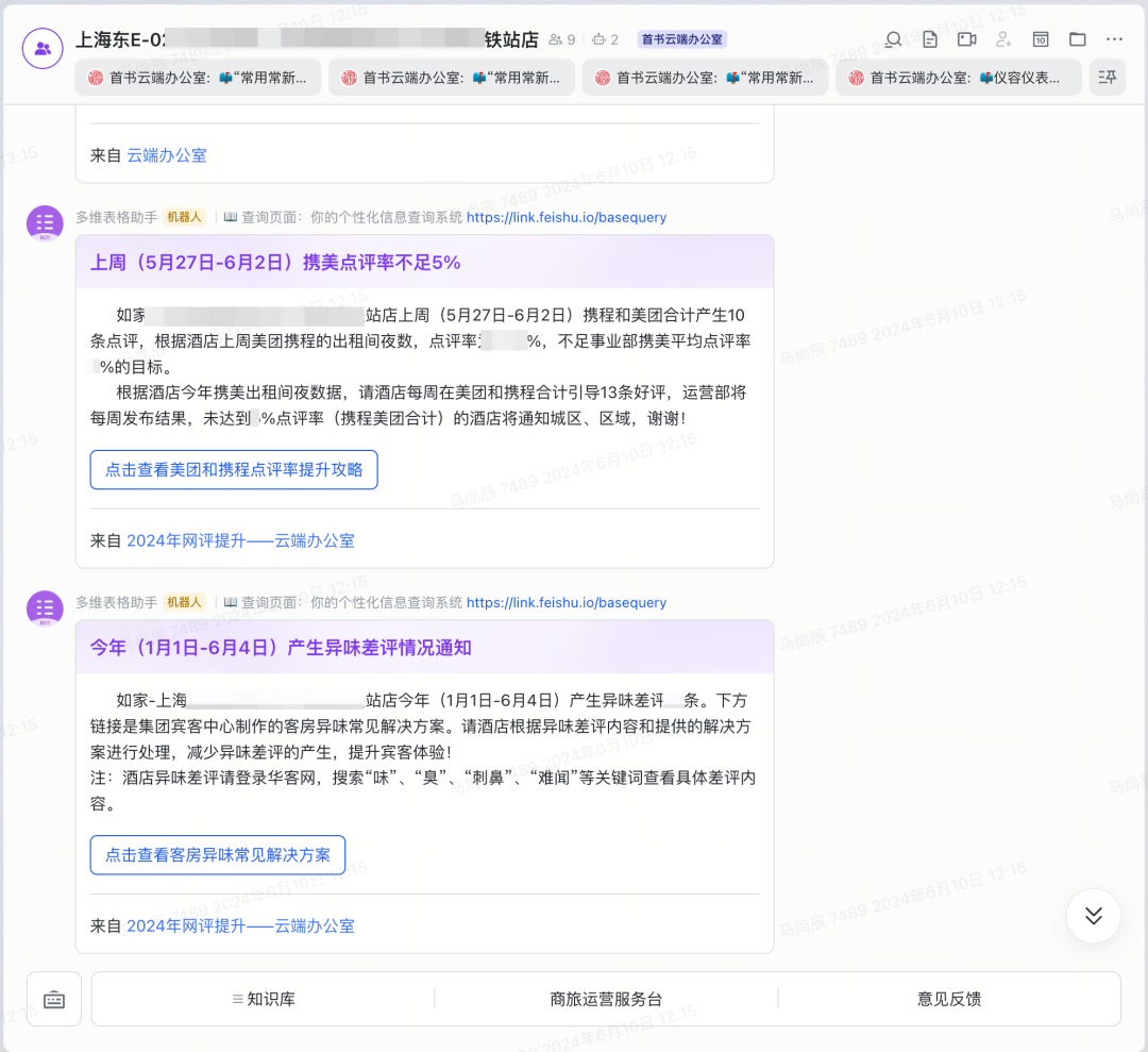 對于連鎖酒店的管理來說,線上和線下的協(xié)同至關(guān)重要,面對跨區(qū)域、跨門店模型的布局,首旅如家攜手飛書打造了“云端辦公室”,集合了所有門店的經(jīng)營數(shù)據(jù)、銷售執(zhí)行數(shù)據(jù)、客戶數(shù)據(jù)等,同時(shí)根據(jù)不同區(qū)域、品牌、模型,批量下發(fā)通知、公告及任務(wù),確保信息直達(dá)相應(yīng)酒店群,減少了信息傳遞的層級與誤差。