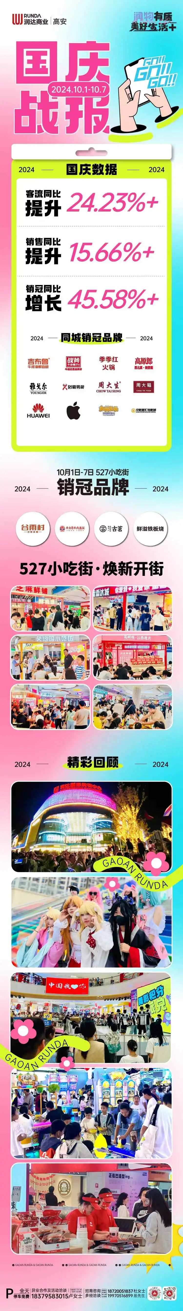 國慶期間(10月1日-10月7日),潤達(dá)國際購物中心客流同比提升24.23%,銷售同比提升15.66%,銷冠同比增長45.58%,同城銷冠品牌包括吉布魯牛排海鮮自助,戰(zhàn)斧牛排餐廳,季季紅火鍋,雅戈?duì),勁霸男裝,周大生,周大福,華為等12家品牌。