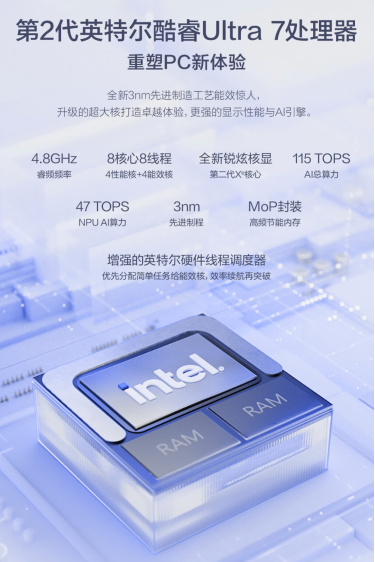 處理器可選第二代英特爾酷睿Ultra7,8核心8線程,最高睿頻可達(dá)4.8GHz。升級增強版NPU 4.0 AI 引擎,NPU AI算力提升至47 TOPS,相較上一代提升4倍。內(nèi)置英特爾銳炫高能核顯,由全新Xe2架構(gòu)驅(qū)動,配合封裝的32GB 8533MHz高頻內(nèi)存和XeSS技術(shù),游戲性能提升高達(dá)60%。CPU+NPU+GPU總AI算力高達(dá)115 TOPS,全面革新AI體驗。