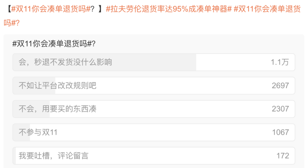 今年雙十一,有媒體做了個(gè)“雙11你會(huì)湊單退貨嗎?”的市場調(diào)研。結(jié)果顯示,有1.1萬人表示“會(huì),秒退不發(fā)貨沒什么影響”,占比高達(dá)64%?梢,大部分消費(fèi)者都是認(rèn)同湊單發(fā)貨的。