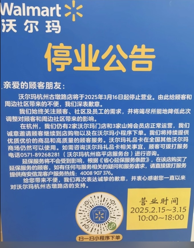 沃爾瑪杭州古墩路店將于3月16日停止?fàn)I業(yè)