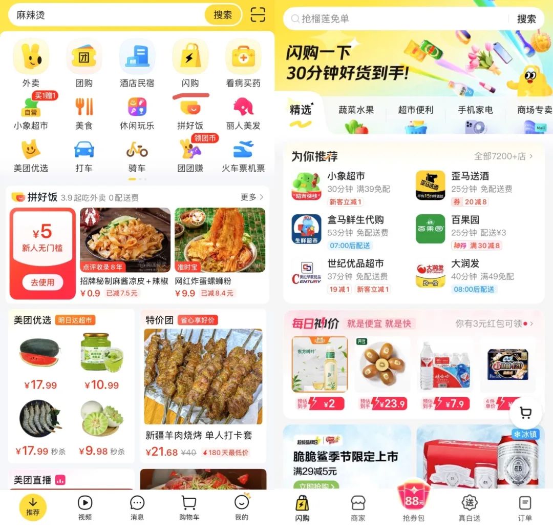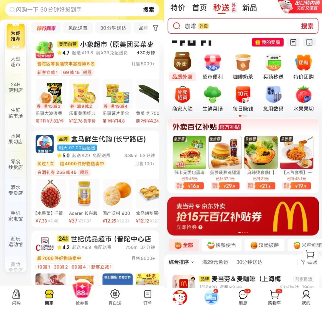 左為美團(tuán)閃購頁面,右為京東秒送,可見在超市、生鮮等供給上的交叉。