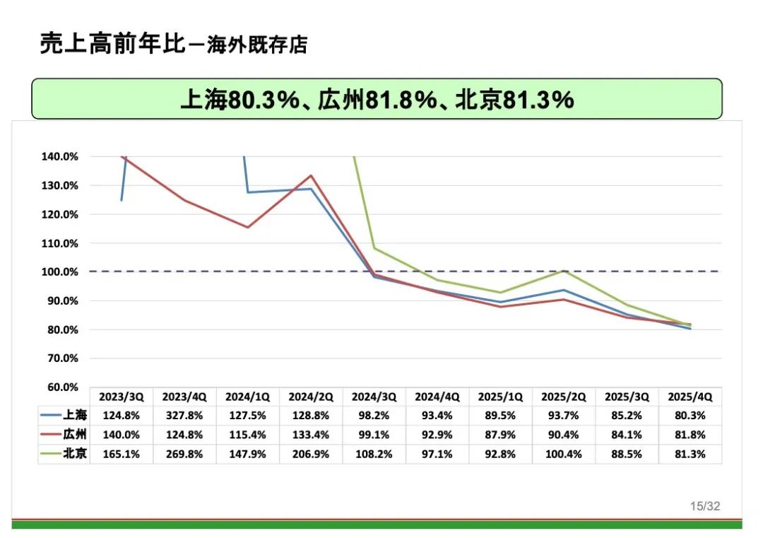 與此同時,同店表現(xiàn)也在持續(xù)走弱。從2024財年第四季度(即2024年6月–8月)三地既存門店的銷售額已經連續(xù)多個季度下滑,到目前仍未恢復。