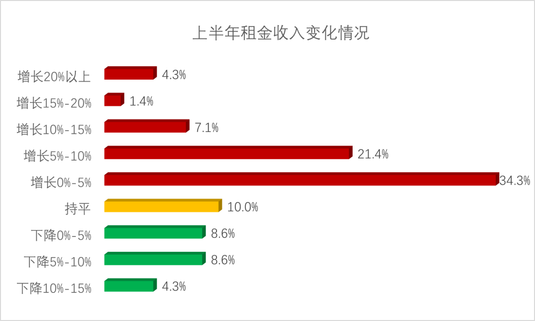 租金收入方面,整體表現(xiàn)相對(duì)穩(wěn)定,同比增長(zhǎng)的占比68.5%,持平的占比10%,租金收入下降的項(xiàng)目占 21%,且主要集中在輕微下降區(qū)間。