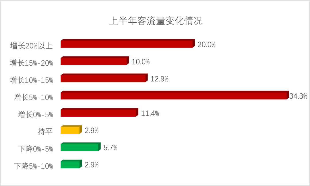 客流方面,80%的項(xiàng)目實(shí)現(xiàn)客流增長(zhǎng),其中增長(zhǎng)幅度超20%的項(xiàng)目占比20%,增長(zhǎng)幅度在15%至20%的項(xiàng)目占比10%;客流同比持平的項(xiàng)目占比2.9%。其余8.6%占比為客流同比下滑。