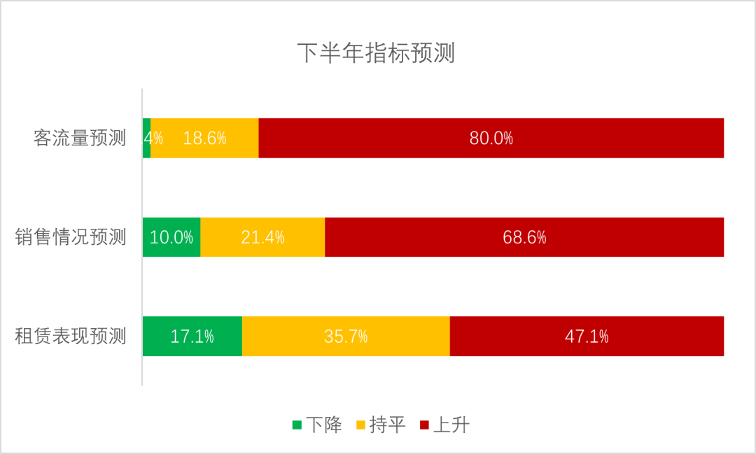 至于2025年下半年的表現(xiàn),預(yù)計(jì)有80%的項(xiàng)目客流增長(zhǎng),10%的項(xiàng)目整體銷(xiāo)售下降。47%的項(xiàng)目預(yù)測(cè)下半年租賃表現(xiàn)預(yù)期向好,36%企業(yè)預(yù)測(cè)持平。