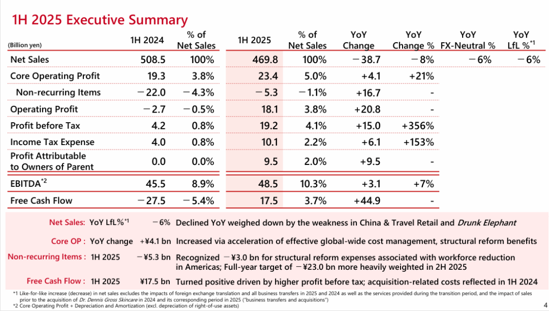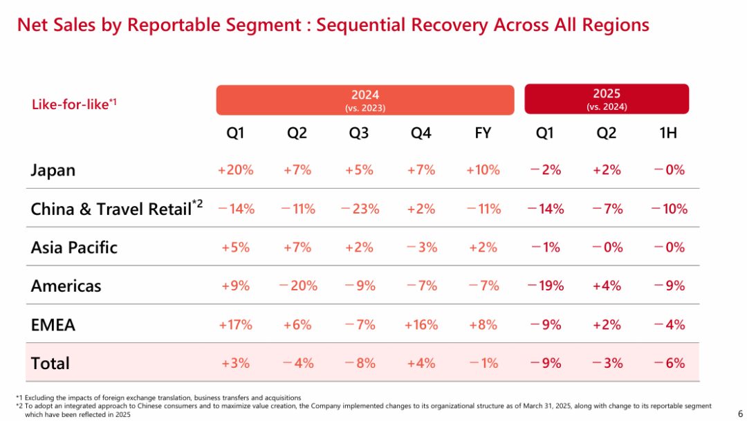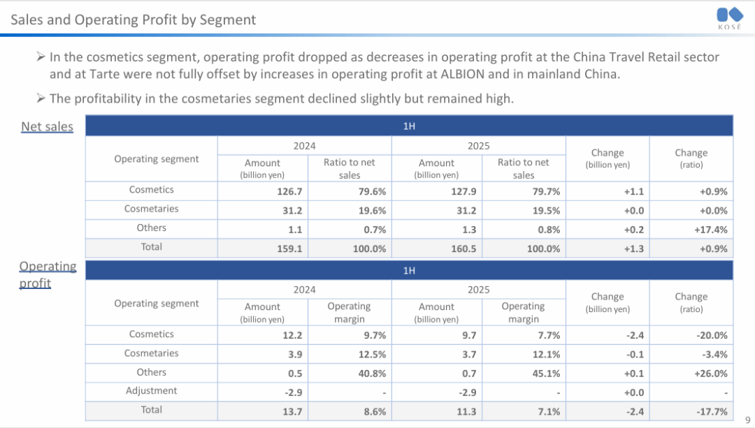 但其化妝品事業(yè)部(核心美妝板塊)表現(xiàn)承壓,銷售額1279億日元(約合62.31億元人民幣),同比微增0.9%,營業(yè)利潤97億日元(約合4.73億元人民幣),同比大跌20%。中國市場(chǎng)(不含旅游零售)同比下滑7.3%,二季度跌幅擴(kuò)至9.6%,受渠道改革、3月和6月大促主動(dòng)縮減促銷等因素影響。