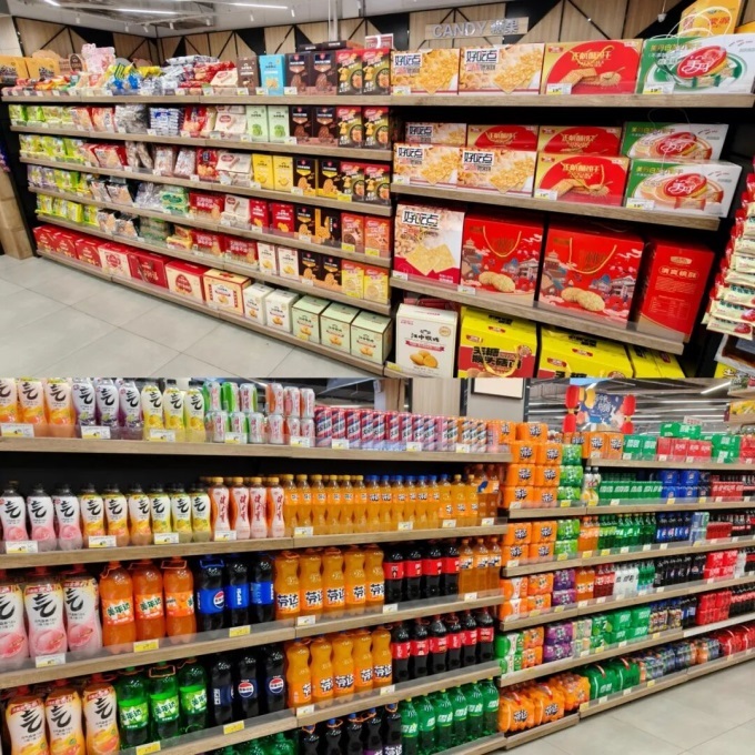 比如在一進入超市的酒水食品區(qū),我們發(fā)現(xiàn),貨架上以可口可樂、百事可樂等常見大流通貨為主,零食則聚焦雀巢、好吃點等傳統(tǒng)品牌,年輕化、網紅款選品并不多。