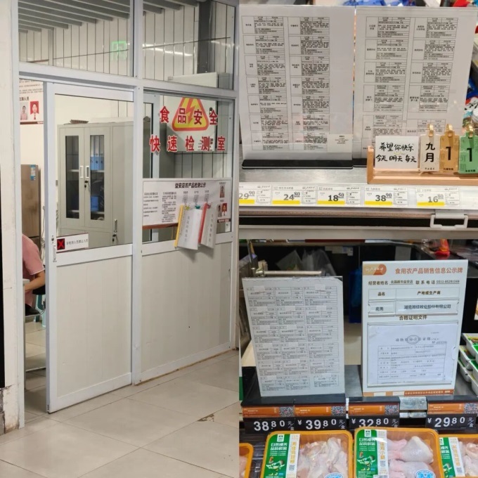 不過,北國超市在食材透明化與新鮮度保障上也有可圈可點之處:當日出清的壽司、現(xiàn)做炒菜等,會明確標注所用食材配料、生產日期與保質期;冷鮮肉產品通過“食用農產品銷售信息公示牌”展示動物檢疫合格證明、保存期限等信息;店內一角還設有食品安全快速檢測室,強化消費信任。