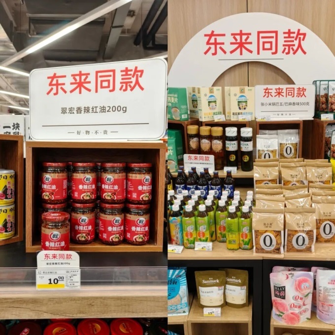 今年6月,永輝超市河北首家胖改店在石家莊長安萬達廣場開業(yè),調改后該店商品結構與胖東來的相似度達80%。受此影響,北國超市內至少有十個貨架陳列前貼有“東來同款”招牌,涵蓋張小米鍋巴、湘佳鮮禽、翠宏香辣紅油等商品,試圖貼近消費者對“高質價比”的需求。