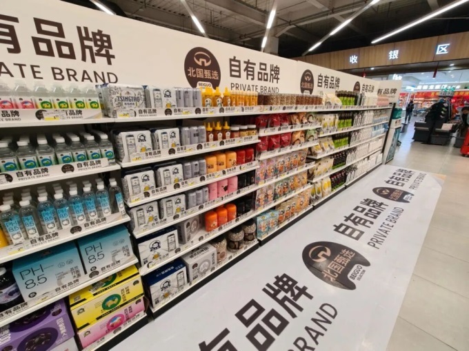 在供應商選擇上,北國超市更傾向于與河北省內的產品專家級企業(yè)合作,凸顯區(qū)域商超的地域特性。但實探發(fā)現(xiàn),其僅設有一處自營商品集中展示區(qū),且該區(qū)域位于臨近出口的不顯眼位置,其余自營商品均按品類分散在不同貨架,相關標識亦不醒目,未能有效引導消費。