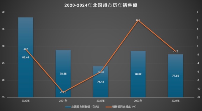 從近五年數(shù)據來看,北國超市始終穩(wěn)居河北省內連鎖超市榜首,門店數(shù)從2020年的47家穩(wěn)步增長至2024年的65家;但銷售額從2020年的88.44億元波動下滑至2024年的77.65億元,與省內第二名信譽樓的差距持續(xù)縮小。