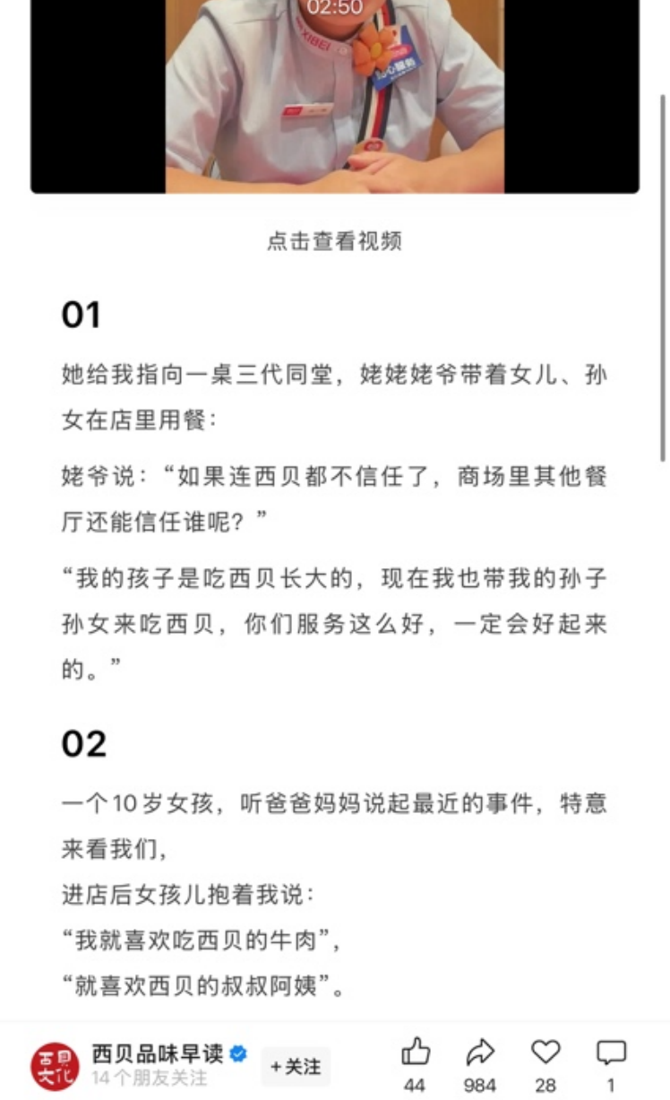 這似乎是在此次輿論危機(jī)期間,西貝不斷對(duì)內(nèi)部強(qiáng)化信心與信任的舉措。