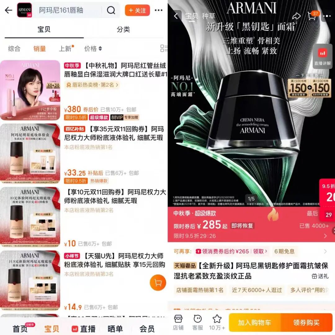 以中國市場為例,阿瑪尼美妝自2006年進(jìn)入中國后,便通過設(shè)立直營專柜強(qiáng)化高端消費體驗,以此逐步滲透線下市場。2018年,阿瑪尼正式入駐天貓開設(shè)旗艦店,首日業(yè)績便達(dá)1700萬元。自此,阿瑪尼美妝加速推進(jìn)數(shù)字化轉(zhuǎn)型,依托“線上+線下”雙軌并行的發(fā)展模式,進(jìn)一步推動中國市場成為其核心增長引擎。