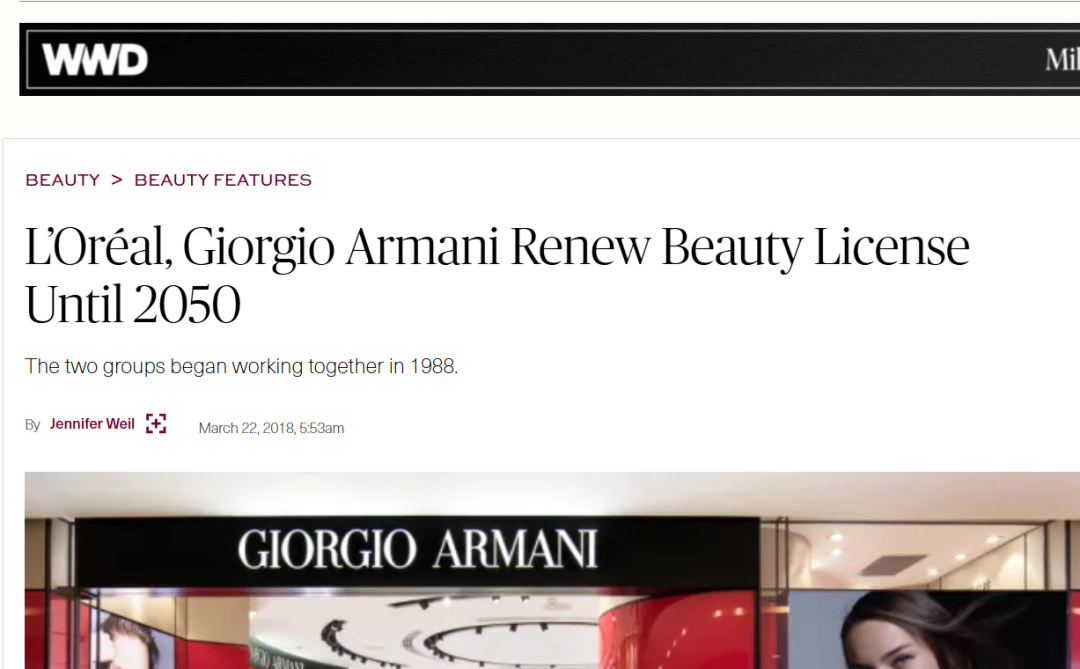 同時,值得一提的是,據(jù)WWD在2018年報道,歐萊雅目前與阿瑪尼的美容許可證已續(xù)簽至2050年。