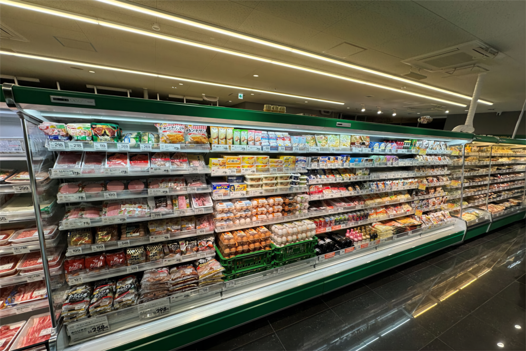 具體而言,生鮮不求齊全,而是極致精選。蔬菜僅保留高頻SKU,水果側(cè)重品質(zhì);鮮魚(yú)區(qū)放棄拼盤等高風(fēng)險(xiǎn)品類,主打調(diào)味魚(yú)片等易管理的補(bǔ)充性商品;精肉區(qū)通過(guò)分層陳列,在有限空間內(nèi)營(yíng)造豐富感;熟食區(qū)提供大量實(shí)惠的炸物、沙拉和便當(dāng);冷凍食品區(qū)(一般設(shè)置4-5組冷柜)則備有意面、餃子、披薩等非常適合獨(dú)居或小家庭生活的商品。