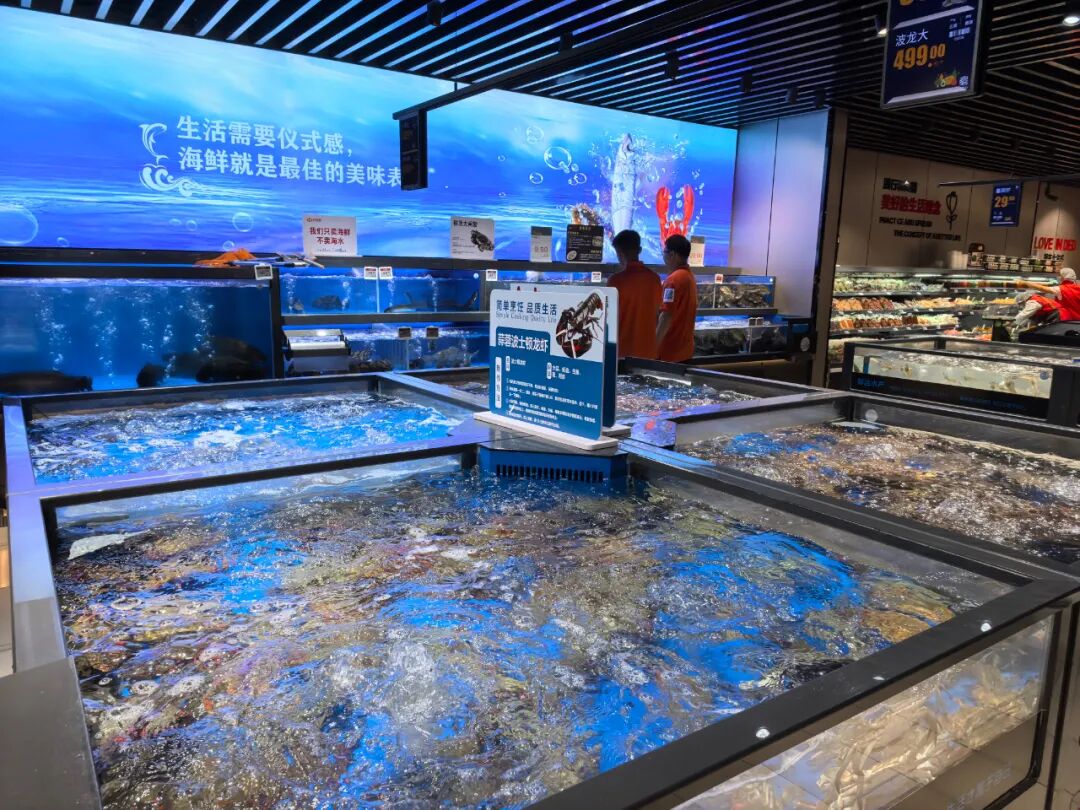 在水產(chǎn)區(qū),商品組合非常豐富,更加注重品質(zhì)。這里有599元/只的澳龍、499元/只的波龍、299元/斤的帝王蟹、188元/斤的波龍、249元/斤的珍寶蟹、149元/斤的面包蟹等品質(zhì)之選,也有鱖魚、鱸魚、多寶魚、生蠔、基圍蝦等極致性價(jià)比之選。