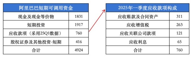 第一個(gè)層次對(duì)應(yīng)資金約4924億元:截至2025上半年,阿里巴巴賬面現(xiàn)金1831億元、短期投資1917億、短期股權(quán)證券及其他投資416億元、各類應(yīng)收款項(xiàng)約760億(采用25Q1數(shù)據(jù)替代),公司短期可調(diào)動(dòng)資金4924億元。
