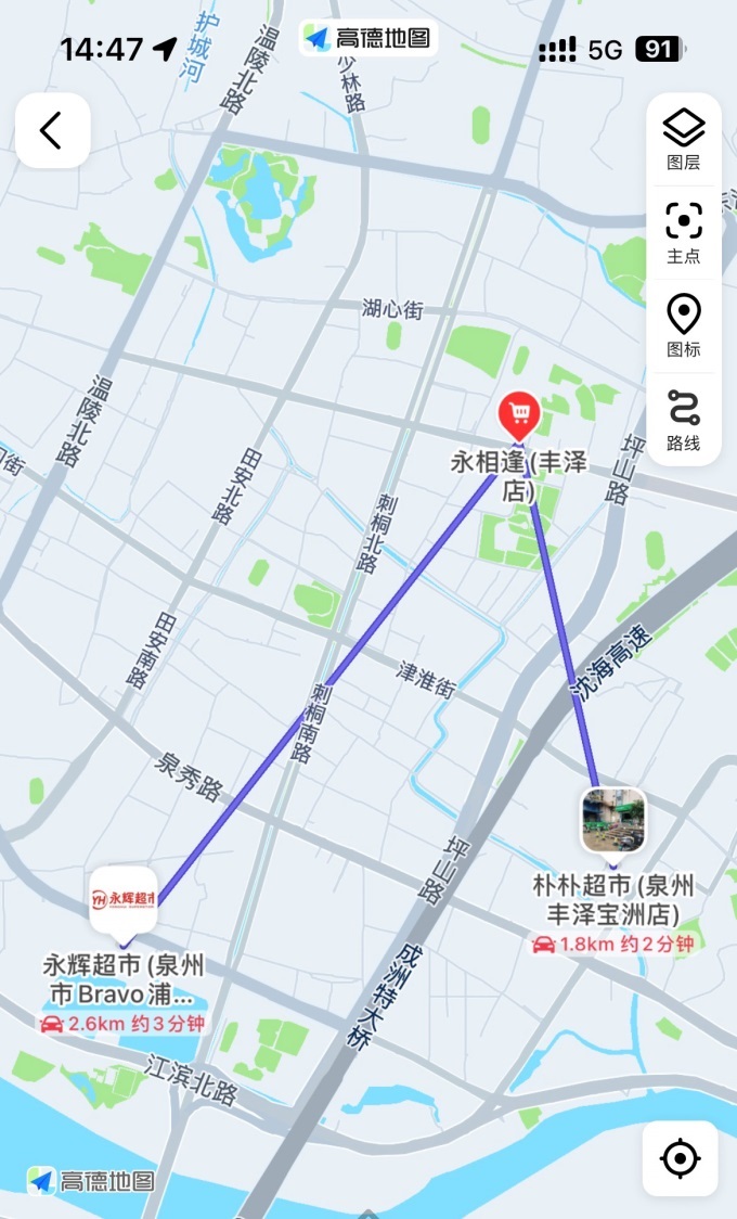 筆者實地走訪永輝超市浦西萬達(dá)店、樸樸超市寶洲店與永相逢超市豐澤店后發(fā)現(xiàn),三家門店直線距離均在3公里內(nèi),僅隔兩個街區(qū)。它們輻射的消費(fèi)人群高度重疊,在這片密集的競爭區(qū)域里,永相逢要穩(wěn)穩(wěn)守住“家門口”的客源,顯然面臨不小挑戰(zhàn)。