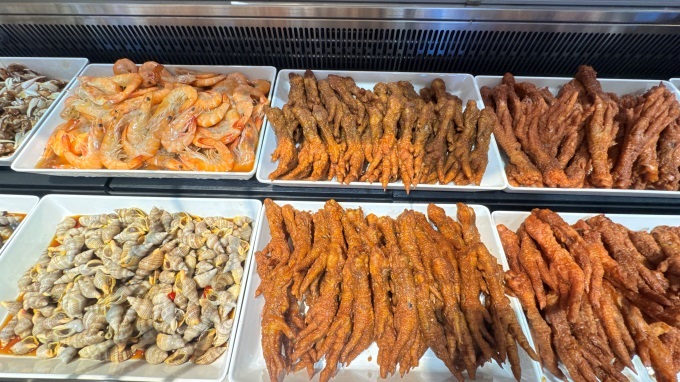 水產(chǎn)區(qū)增加海鮮廚房,明檔操作現(xiàn)點(diǎn)現(xiàn)做;三文魚操作分切間,嚴(yán)格把控衛(wèi)生標(biāo)準(zhǔn),讓每一片三文魚安全又美味。肉品區(qū)增加現(xiàn)場煎牛排、烤肉串品類,免費(fèi)給顧客提供煎烤服務(wù)。鮮切肉串現(xiàn)烤現(xiàn)售,從選肉、分切、穿串到烤制全程可見。