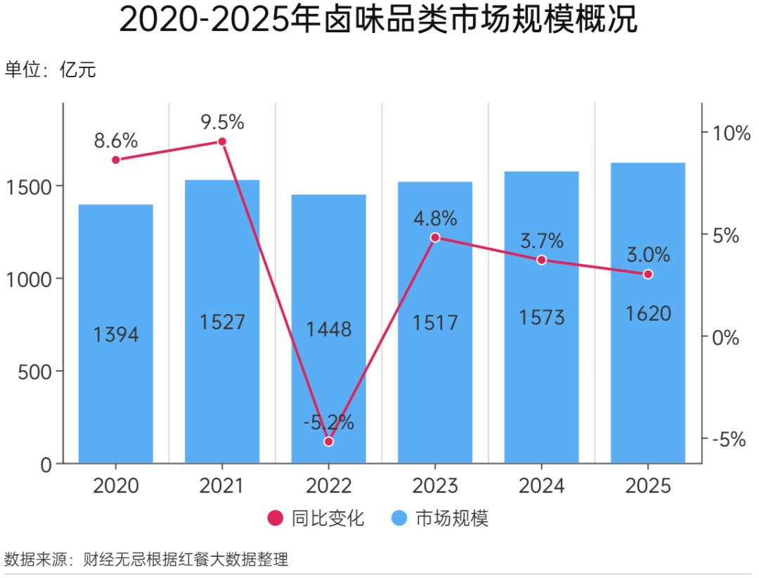 紅餐產(chǎn)業(yè)研究院數(shù)據(jù)顯示,2024年鹵味品類市場規(guī)模為1573億元,同比增速僅為3.7%;預(yù)計2025年將微增至1620億元,增速進一步放緩。
