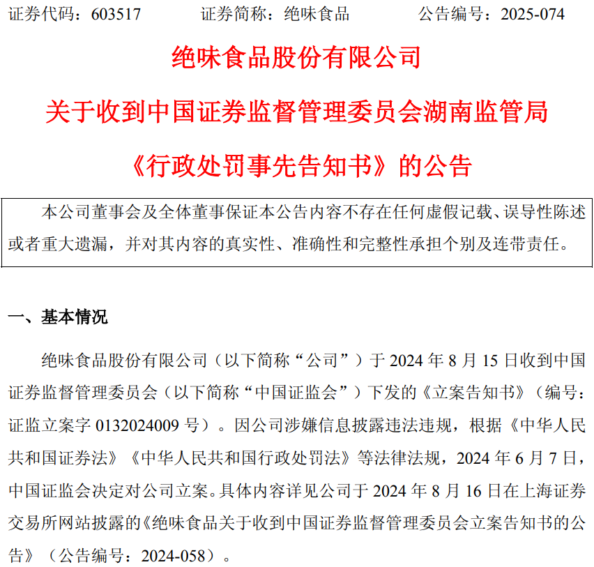 中國證監(jiān)會湖南監(jiān)管局決定對絕味食品責(zé)令改正、給予警告,并處以400萬元罰款;