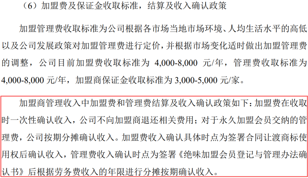 從絕味的招股書來看,公司明確列示的收入類別中只有“加盟費管理收入”,并未提及裝修款。這說明在IPO時,公司和中介機構(gòu)都認為裝修業(yè)務(wù)不屬于主營收入范疇。