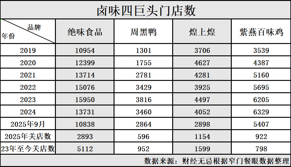 而同一時期的周黑鴨、煌上煌和紫燕百味雞,各關(guān)店952家店、1599家店、798家店,四家鹵味巨頭,合計關(guān)店8461家。