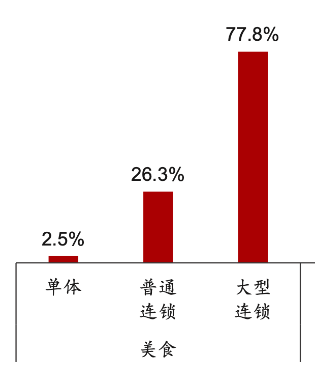 浙商證券曾在去年做過復(fù)盤,發(fā)現(xiàn)與達人合作的抖音生服餐飲商家中,大型連鎖商家的占比高達77.8%,普通連鎖商家占比26.3%,單體商家的占比低至2.5%。